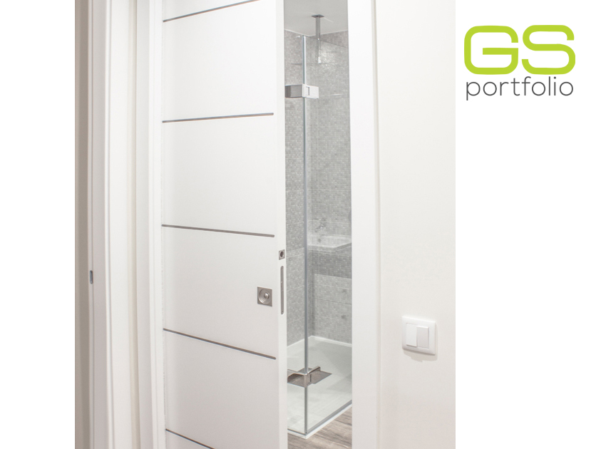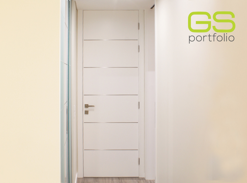 - Porte battante GS DOORS, modèle PLUS (jusqu'au plafond), en laqué blanc mat avec coins. Serrure magnétique.