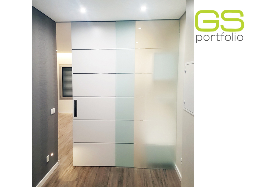 - Système de porte coulissante INSIDE by OPENSPACE avec porte laquée blanc mat avec coins. Conjugué avec un panneau en verre mat blanc fixe avec coins.