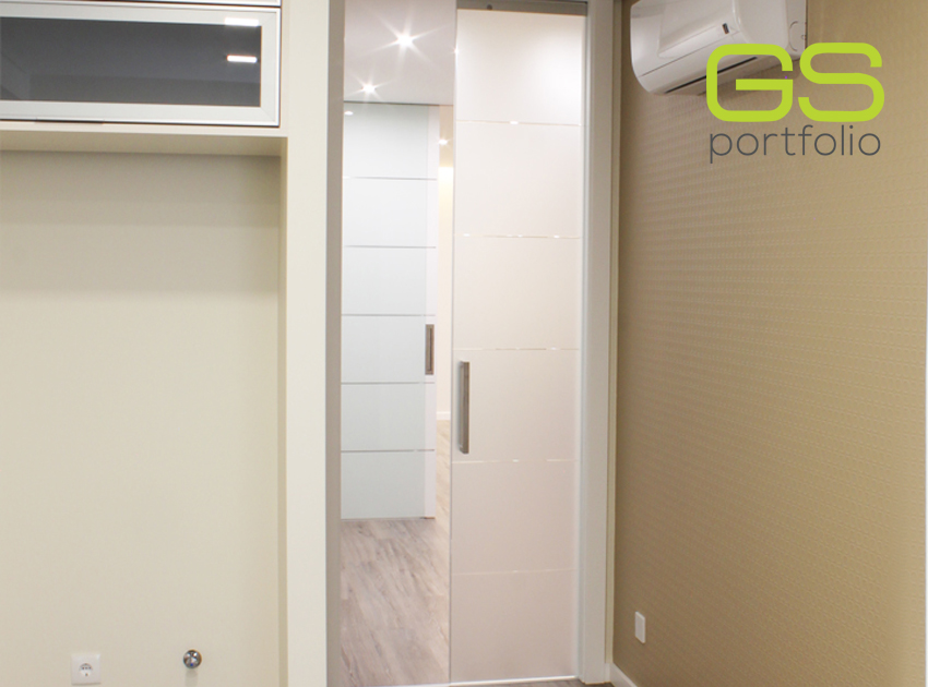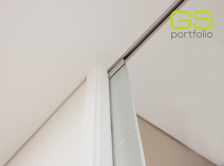 Contre-châssi UNICO PLUS avec porte en verre dépoli avec 5 4 rainures, habillage et chambranle en bois en laqué blanche mate. By OPENSPACE!