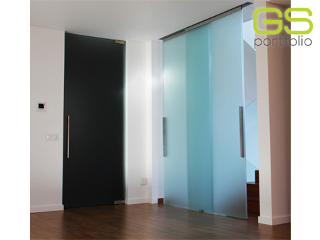 Deux portes coulissantes en verre dépoli avec sens d'ouverture opposé.
