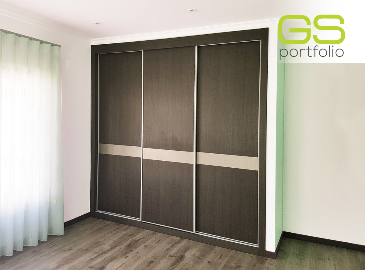 - Armario empotrado GS CONCEPT de 3 puertas correderas en vinilo: Marrón Roble, con listón decorativo efecto metalizado y perfil lateral tirador de aluminio.