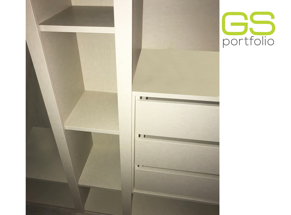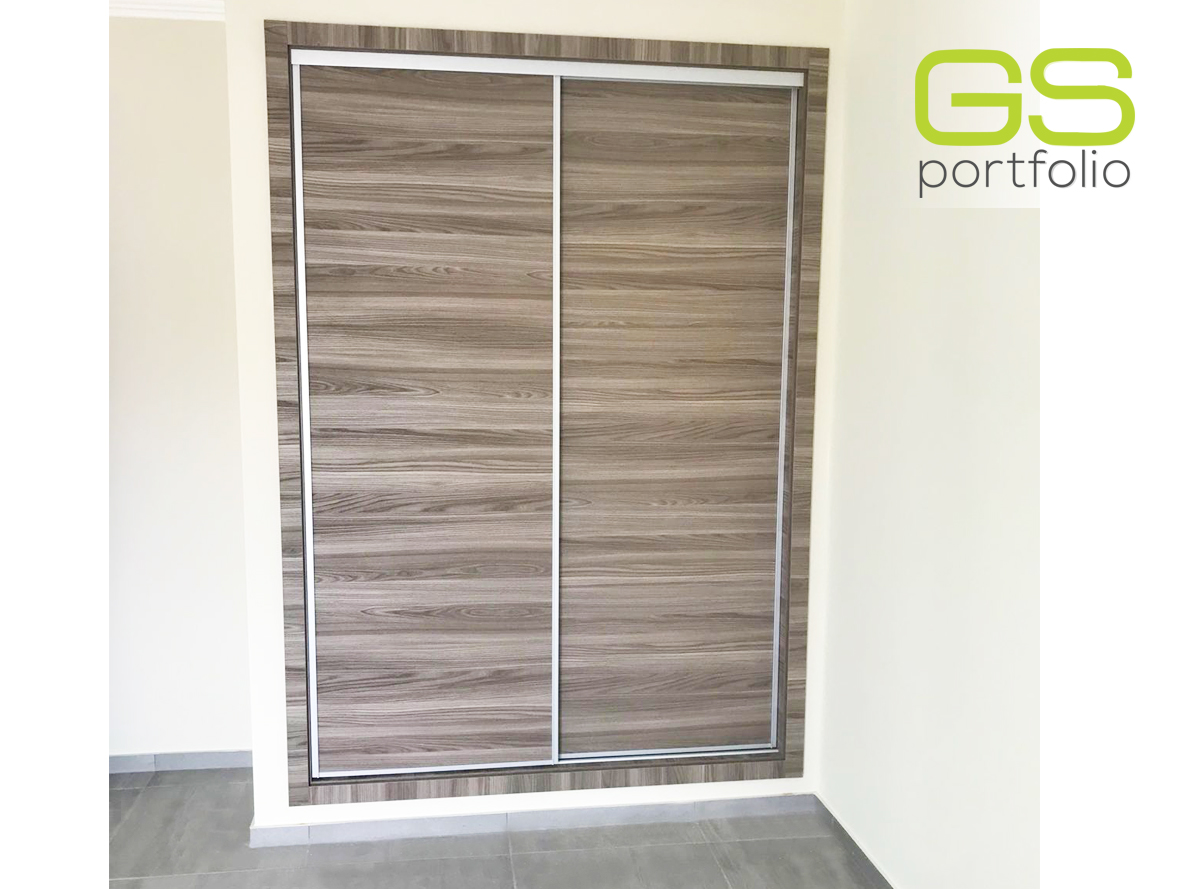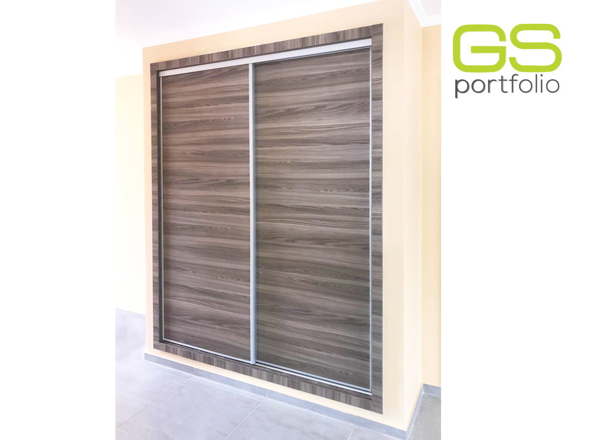 - Placard encastrée GS CONCEPT avec 2 portes coulissantes. Feuille de vinyle : Olmo Gris et profil latéral poignée en aluminium.
